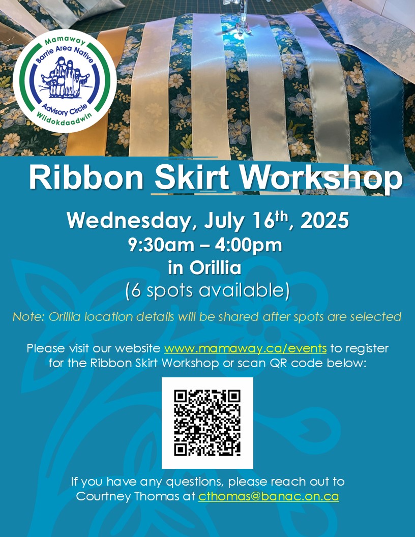 Join Mamaway Wiidokdaadwin Life Promoter’s, Courtney Thomas and Bawd Elliott for a Ribbon Skirt Workshop on Wednesday, July 16th, 2025, from 9:30am – 4:00pm.