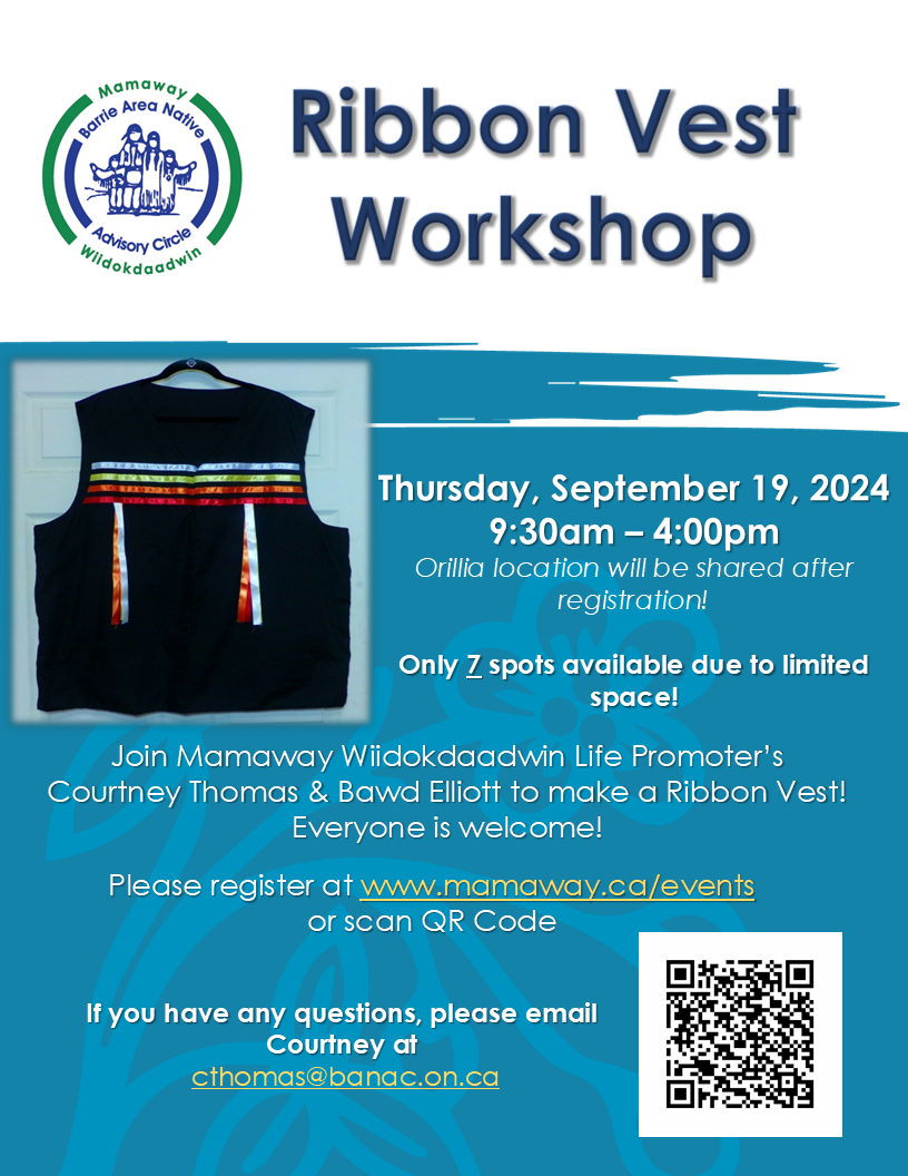 Join Mamaway Wiidokdaadwin Life Promoter’s Courtney Thomas & Bawd Elliott to make a Ribbon Vest!