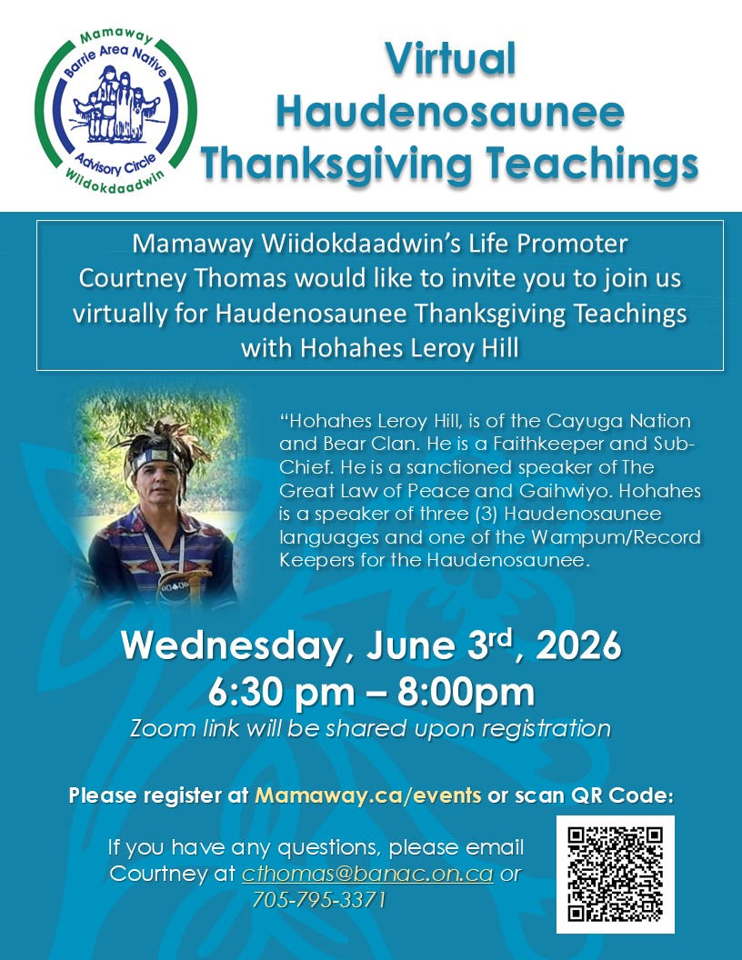 Mamaway Wiidokdaadwin’s Life Promoter Courtney Thomas invites you to join us virtually for Haudenosaunee Thanksgiving Teachings with Hohahes Leroy Hill on Wednesday, June 3rd, 2026 from 6:30 pm – 8:00 pm!