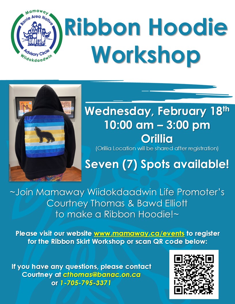 Join Mamaway Wiidokdaadwin Life Promoter's Courtney Thomas and Bawd Elliott for a Ribbon Hoodie Workshop on Wednesday, February 18th, 2026! Date: Wednesday, February 18th, 2026...
