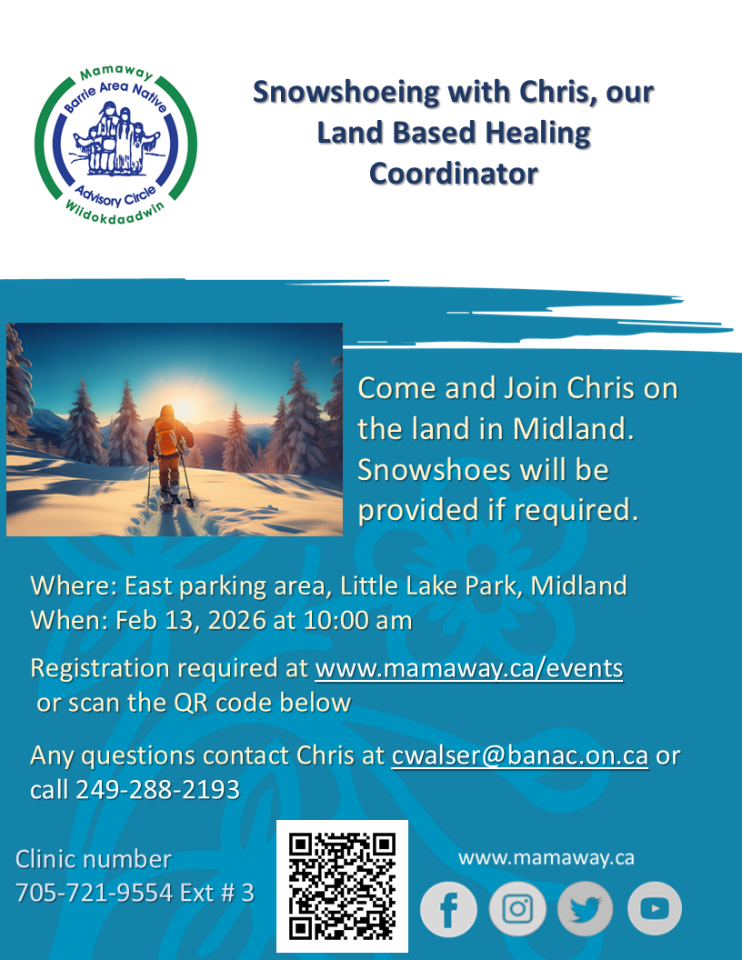 Come join Chris the Land Based Healing Coordinator and Amaru from the Barrie Native Friendship Center as the lead people on a snowshoe hike through...