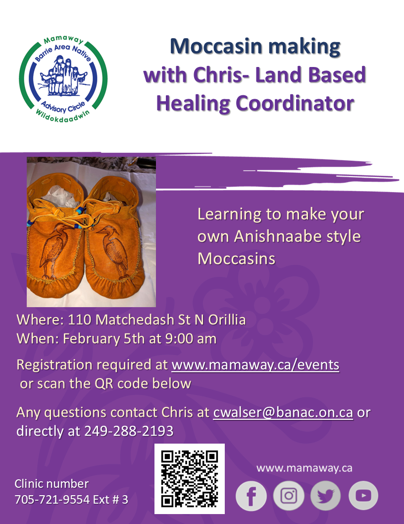 110 Matchedash St. N. 110 Matchedash St., N, Orillia, ON, CanadaCome join Chris to learn how to make your own Anishnaabe style Moccasins on Feb 5th, 2026. Starting at 9 am until 4 pm. This...