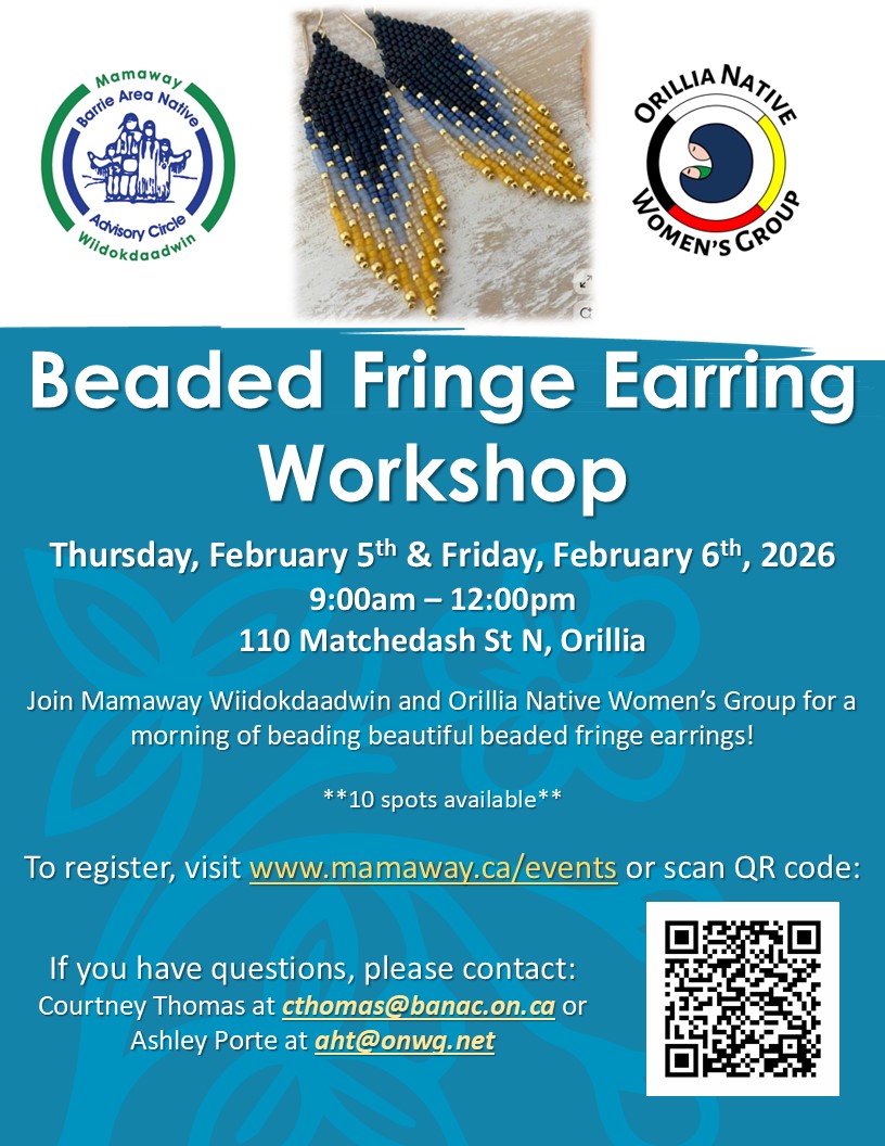 Join Mamaway Wiidokdaadwin and Orillia Native Women's Group for a Beaded Fringe Earring Workshop on Thursday, February 5th & Friday, February 6th, 2026 from 9:00am...
