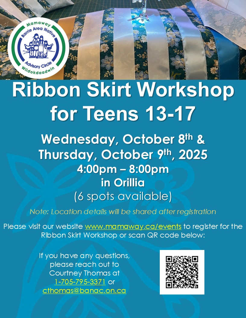 Join Mamaway Wiidokdaadwin Life Promoterâs, Courtney Thomas and Bawd Elliott for a Ribbon Skirt Workshop for Teens on Wednesday, October 8th & Thursday, October 9th,... |