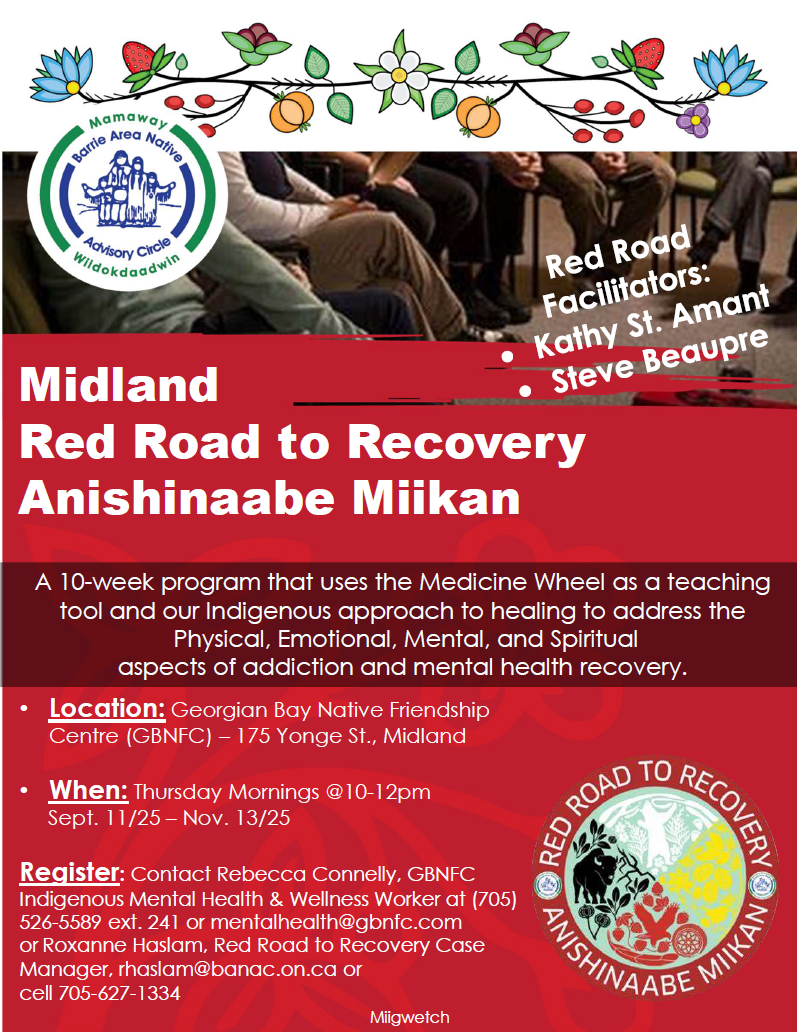 Good Day, We will be hosting a 10-week Red Road to Recovery session open to all community members over zoom. Please contact Roxanne to register...