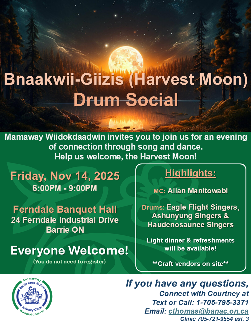 Good day, Mamaway Wiidokdaadwin is thrilled to announce our 4th Annual Harvest Moon Big Drum Social. Date: Friday, November 14th, 2025 Time: 6-9pm Location: Ferndale... |